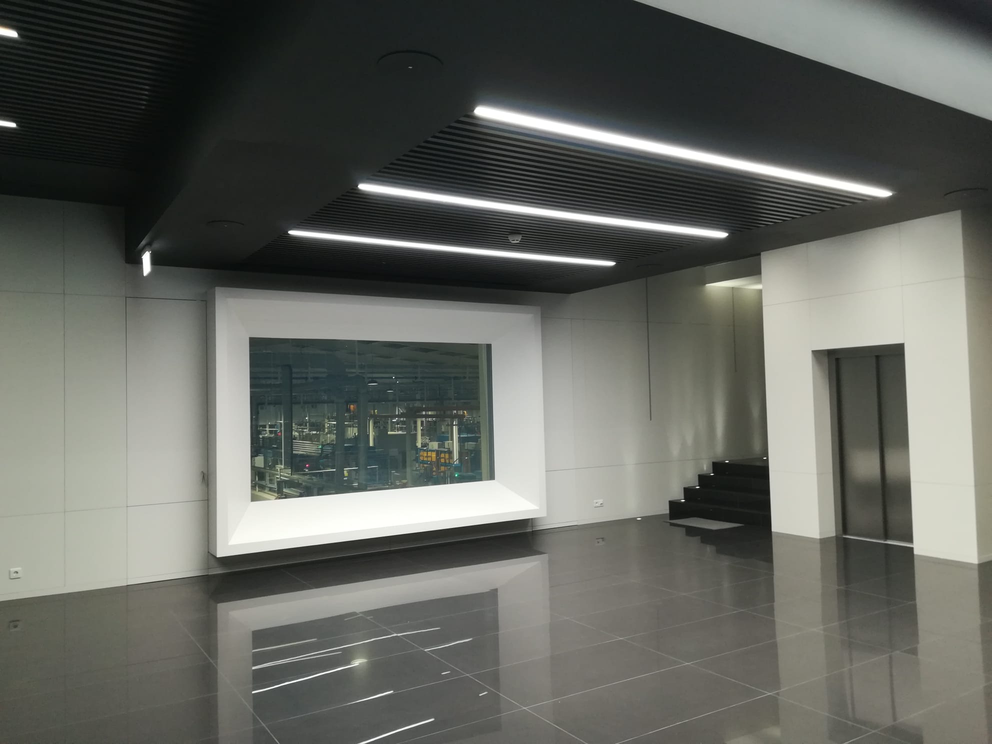 Produção e aplicação de painéis de revestimento lacado e moldura para ecrã fotovoltaico com dimensões de 4×2,5mt em unidade fabril.